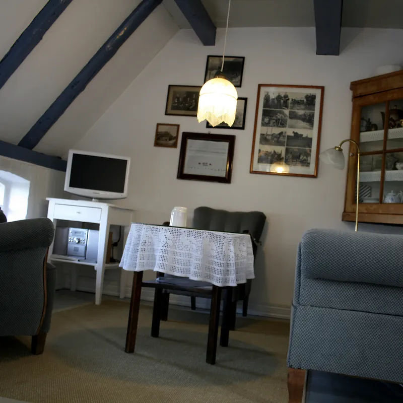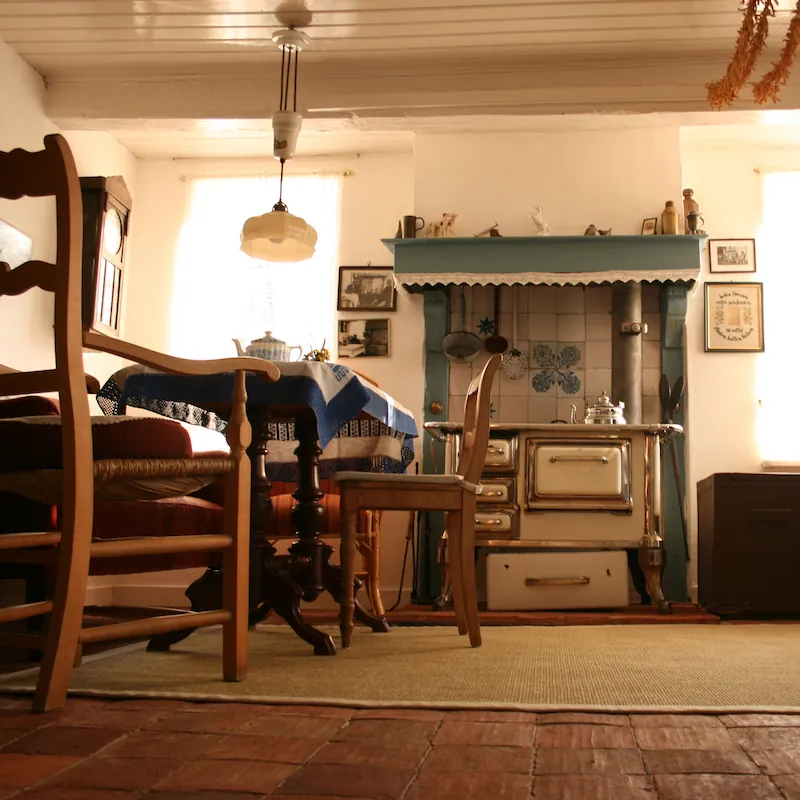 - Historische Wohnstube mit Stangenofen (nutzbar, Torf vorhanden), Wohnzimmertisch und Ostfriesensofa – ideal für eine ostfriesische Teestunde