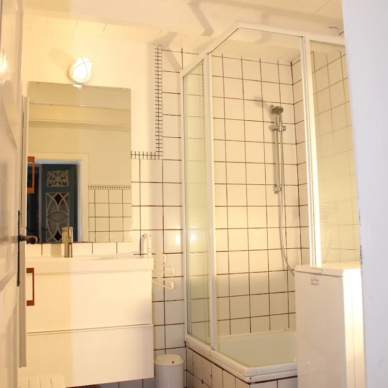 - Badezimmer mit Dusche und Waschmaschine (Handtücher vorhanden), saniert in 2026