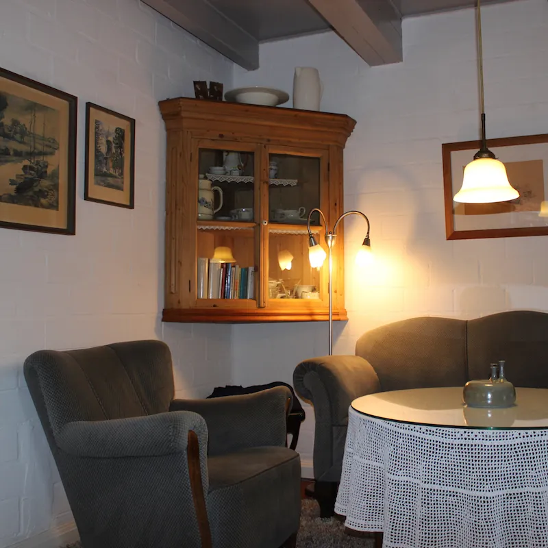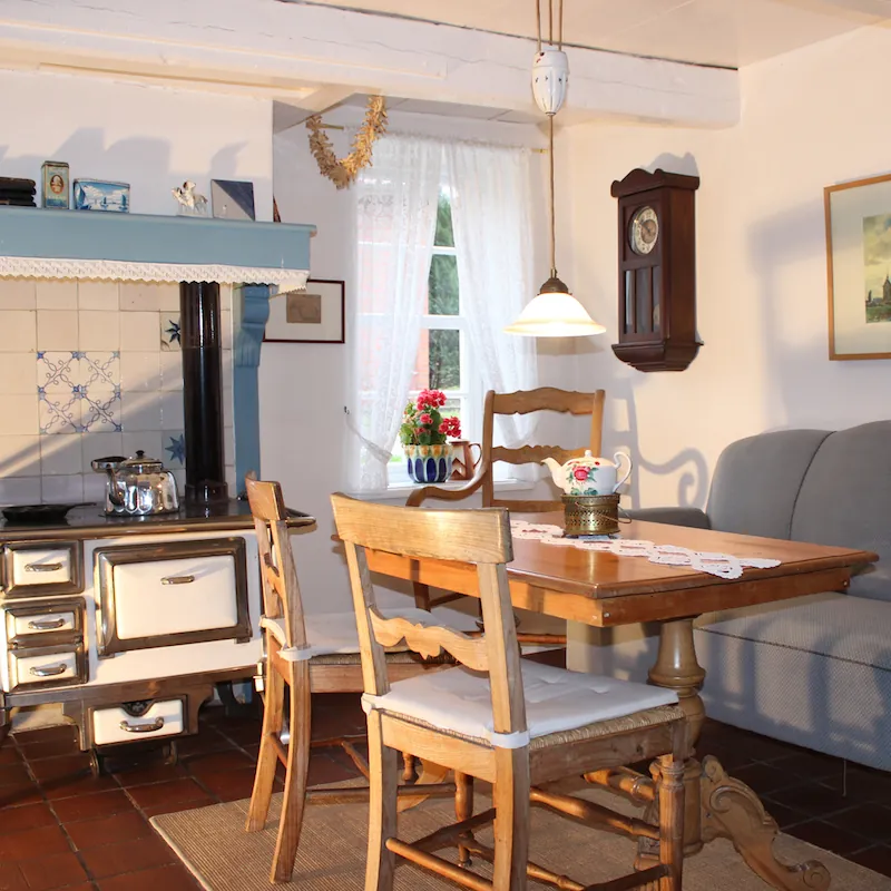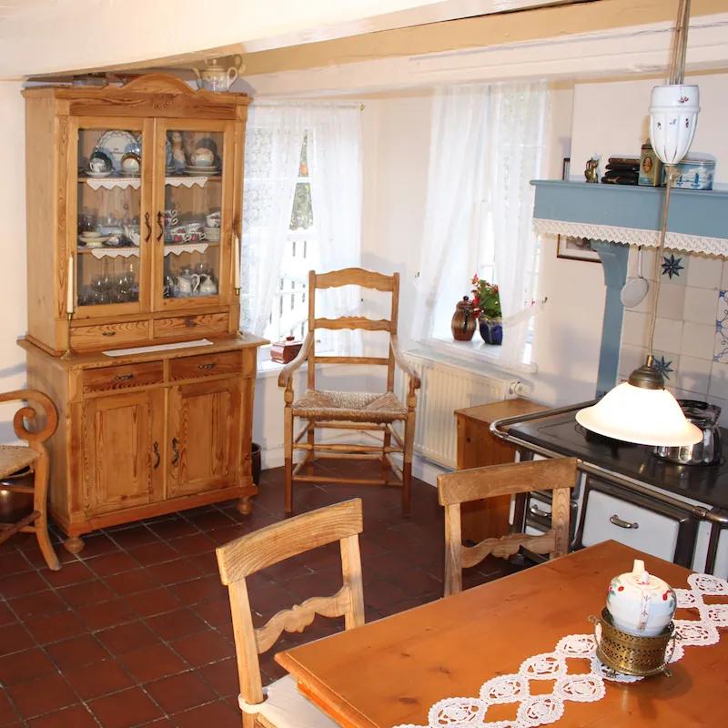 - Historische Wohnstube mit Stangenofen (nutzbar, Torf vorhanden), Wohnzimmertisch und Ostfriesensofa – ideal für eine ostfriesische Teestunde mit historischem Teeservice