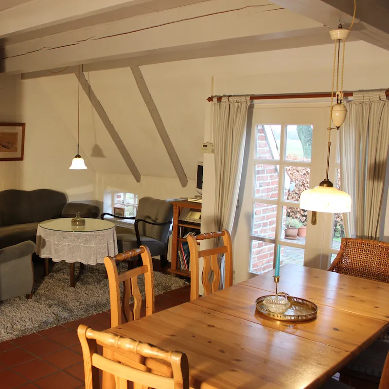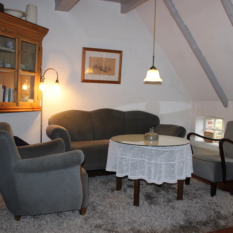 - Wohn-Esszimmer mit gemütlicher Sitzecke, Ostfriesensofa und passendem Sessel, TV, DVD, CD, Radio