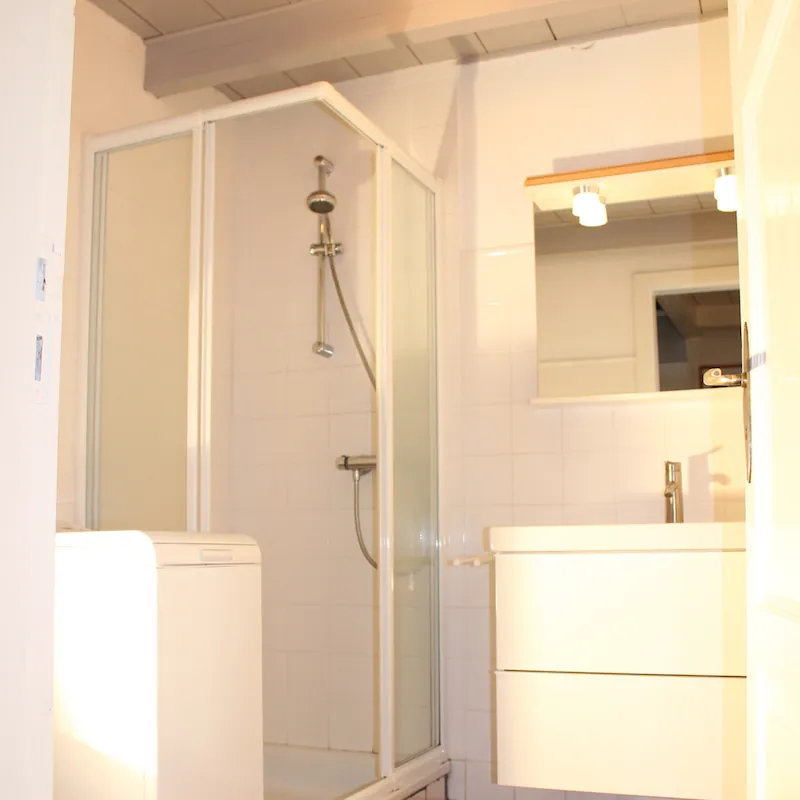 - Badezimmer mit Dusche und Waschmaschine (Handtücher vorhanden)